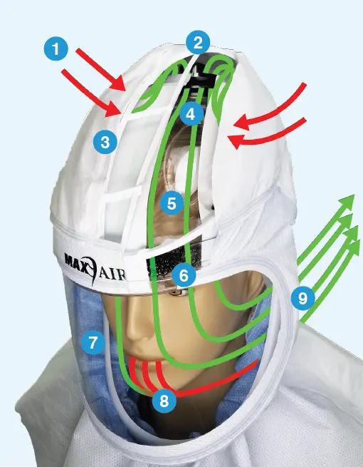 The Clean Air passing through the front Air diffuses, passes gently in front of the face for effortless breathing, a head cooling effect and maintenance of a fog free lens (7). As the Clean Air becomes mixed with exhaled Air (8) it becomes contaminated with CO2 and potential viral and bacterial contaminants and is re-cleansed (Source Control) as it is swept through the Hood Back OPR Filter (9).