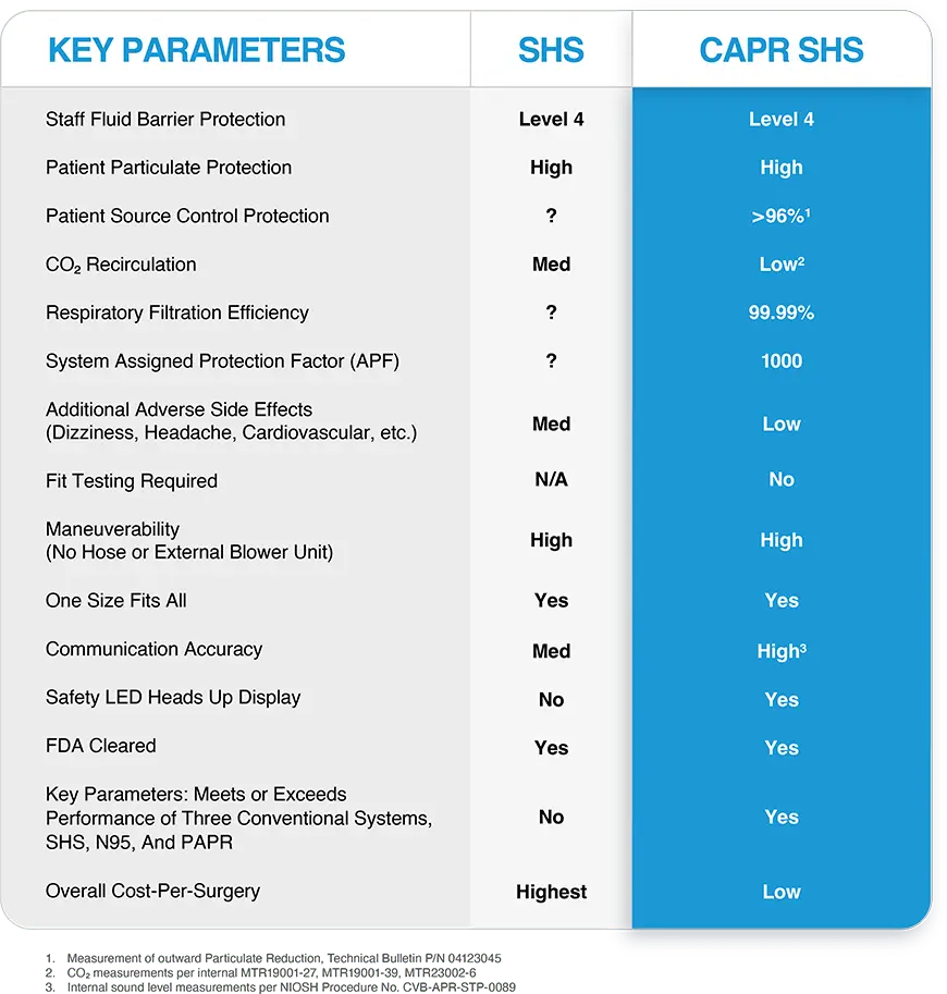 The Advanced CAPR Surgical Helmet System (SHS) is the innovative choice over traditional surgical helmets and standard surgical masks. This NIOSH-approved, loose-fitting Powered Air Purifying Respirator (PAPR) eliminates external air tubes and blower units, providing superior protection and exceptional comfort.