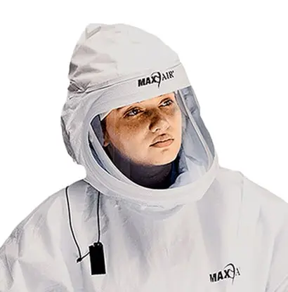 Outside Toxic Air (1) is pulled by the Motor (2) in through the NIOSH Approved PAPR100-N Hood Filter (3) and cleansed with 99.99% Efficiency.